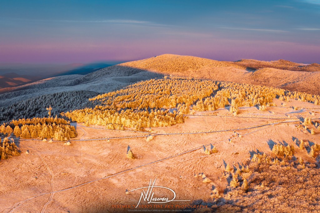 Thankfully, when we again ventured up the winding, snow-covered three-mile dirt road – now more icy and slick, presenting a bit more of a challenge for our 2WD minivan with summer tires – we found that the majority of the summit’s snow was still very much intact. Arriving in the late afternoon, some 30 hours after the last flakes had fallen, we decided to stick around for sunset. Boy was it worth it! Minute by minute, as the sun sunk below the horizon, the scene changed, casting yellow, then orange, then purple pastel hues on the snow-covered summit. One tree, in particular, though full-sized, appeared like a bonsai tree with it’s coat of white snow lingering upon its outer branches.